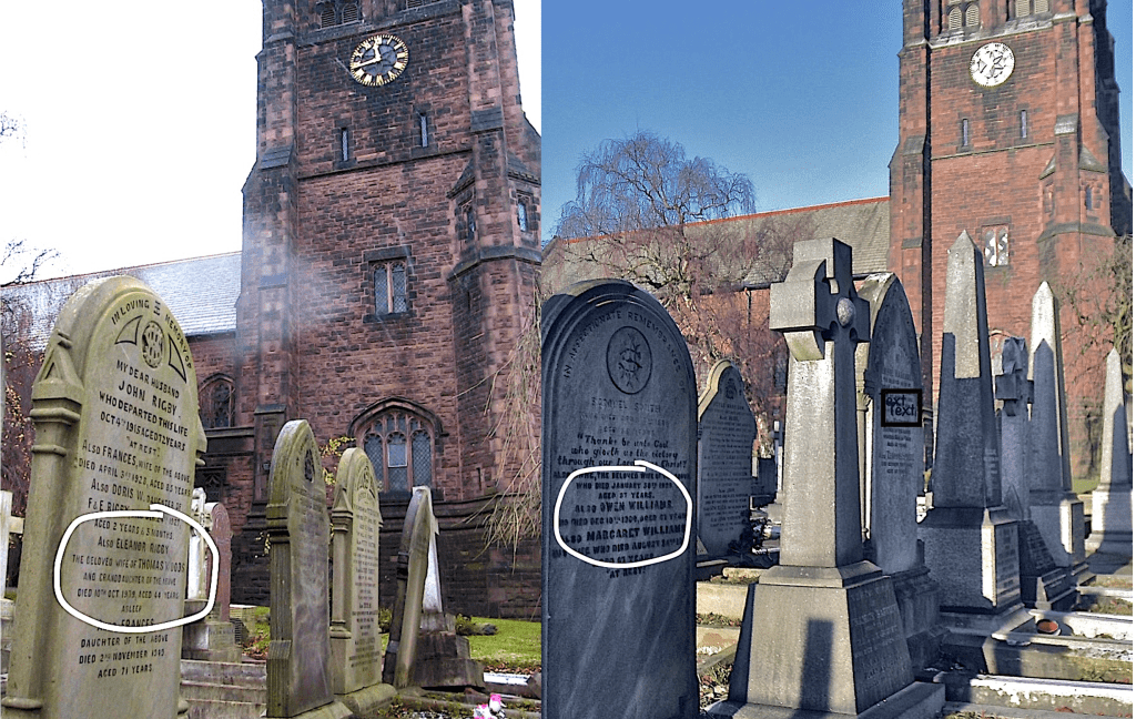 My Maternal Grandmother, Margaret Williams and her father, Owen Williams, are buried in St. Michael’s church cemetery in Garston, Liverpool, England. In the image below, you can see the Gravestone with the Anglican style Church behind (on the right side of the image). Two miles away there is another Gravestone in a similar orientation in the cemetery grounds of St. Peter’s church in Woolton, Liverpool. This is the quite famous gravestone of an “Eleanor Rigby” of the Beatles fame. Many have speculated that the Young Quarry Men likely played in this vicinity, although I recall that Paul has never claimed that this gravestone was ever involved in the creation of the song. So I feel that it is a pure coincidence. I recently re-discovered this image of my Grandmother’s gravestone and was struck by the coincidental similarity of the image to that of Eleanor’s.