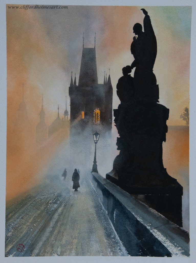 This is an 11 by 15 inch watercolor piece augmented with PanPastels depicting The iconic Charles Bridge in Prague.